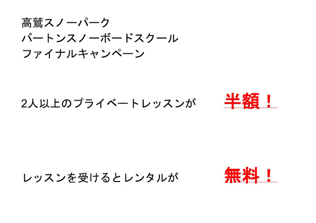 高鷲スノーパークも残すところ9日間となりました。 シーズン最後に、日頃の感謝を込めてファイナルキャンペーンを行います。 内容は・・・・・・ 2人以上のプライベートが半額になるので、お友達と一緒にお得にレベルアップ! そし […]