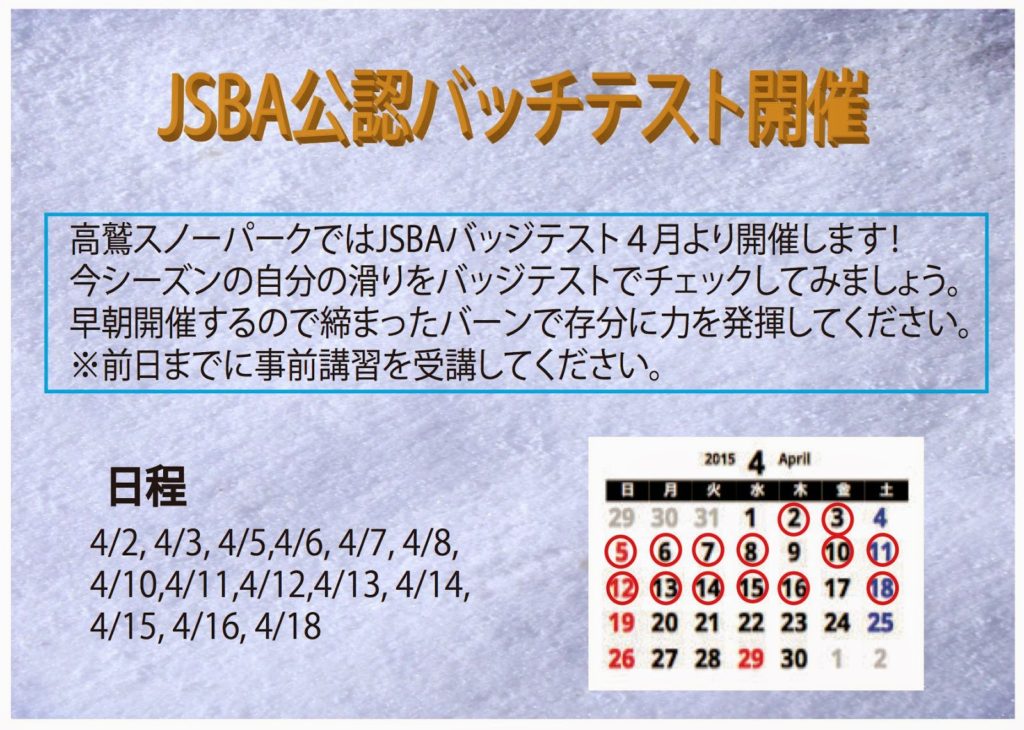 シーズンも後半戦になってきました。 春と言えば、バッジテスト! シーズン終了前に、JSBAバッジテストにチャレンジしてみませんか? 高鷲スノーパークでは、4月からバッジテストを行います。 それも、朝9時から開始します。 […]