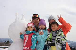 雪だるまの前で記念撮影 CH2クラスの、レネちゃんセナちゃんトヨキ君 みんなでリフト1本がんばりました またきてね〜